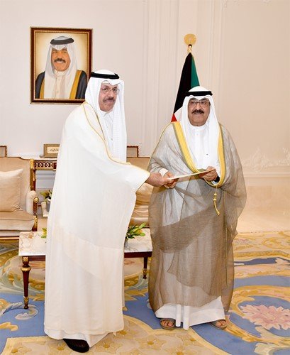 استقبل سمو ولي العهد الشيخ مشعل الأحمد الجابر الصباح حفظه الله بقصر بيان صباح اليوم سمو الشيخ أحمد نواف الأحمد الجابر الصباح رئيس مجلس الوزراء حيث رفع إلى سموه حفظه الله كتاب استقالة الحكومة